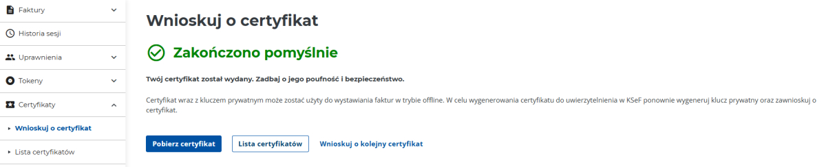 Certyfikat do obsługi trybu offline generuje się w Aplikacji Podatnika (ksef.podatki.gov.pl/aplikacja-podatnika-ksef-20/) - po zalogowaniu należy przejść po prawej stronie do zakładki Certyfikaty, wybierając opcję Wnioskuj o certyfikat.