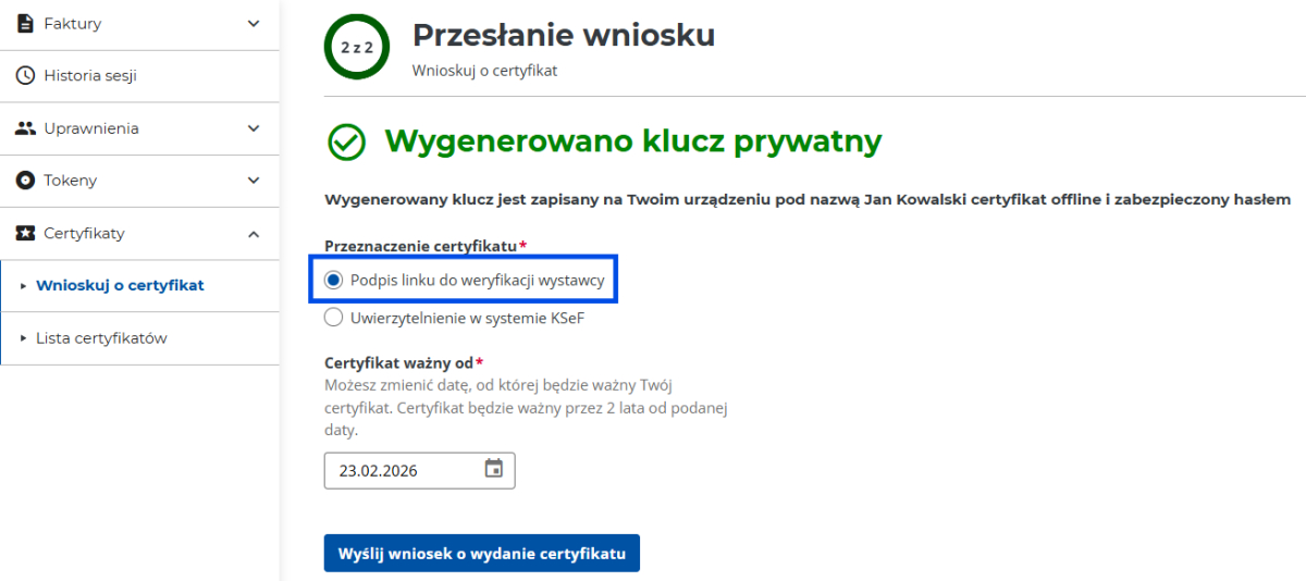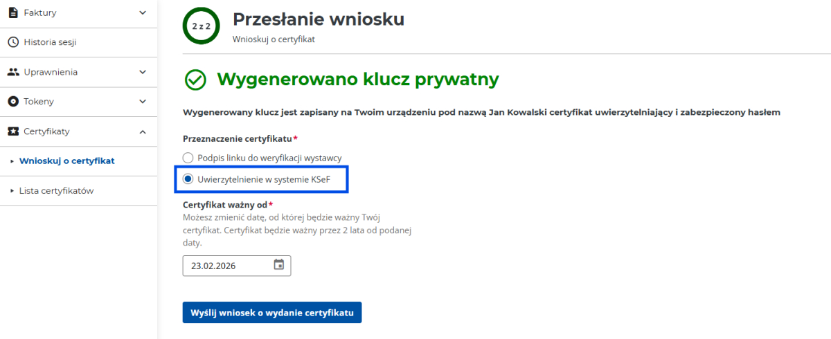 W aplikacji podatnika Krajowy System e-Faktur przedsiębiorca musi wskazać przeznaczenie certyfikatu. I właśnie w tym miejscu pojawia się jedna z największych wątpliwości praktycznych. System posługuje się bowiem dwoma nazwami: