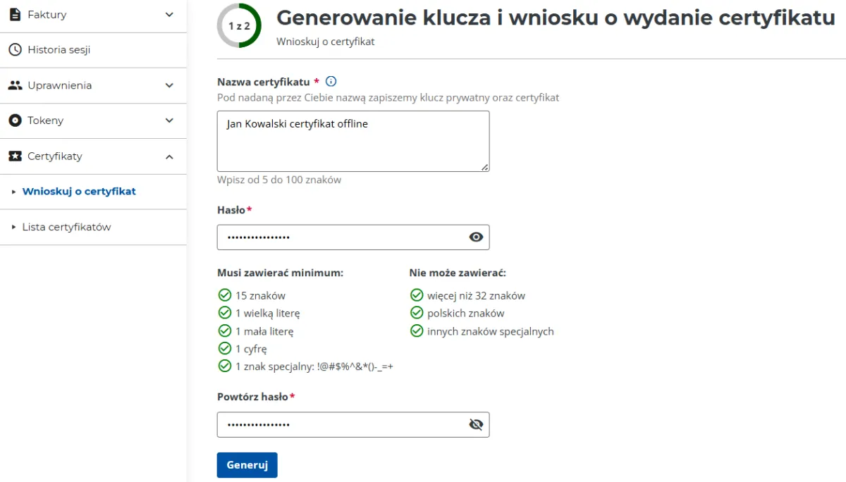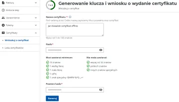 Jako nazwę certyfikatu można w tym miejscu wpisać imię i nazwisko z dopiskiem certyfikat offline, np. Jan Kowalski certyfikat offline. Następnie podajemy hasło zgodnie z wytycznymi. Bardzo ważne, aby zapisać w bezpiecznym miejscu hasła do certyfikatu, bowiem w przypadku utraty hasła nie ma możliwości go odzyskać/ zmienić. Po wskazaniu ww. danych należy wybrać opcję Generuj.